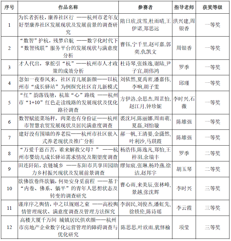 2022年4月16日至17日,由浙江省教育厅、浙江省统计局联合主办的浙江省第十届“民生民意杯”大学生统计调查方案设计大赛决赛在浙江工商大学举行。我院学生荣获省一等奖7项、二等奖2项、三等奖3项。