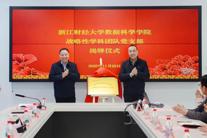 11月25日,我院战略性学科团队党支部揭牌暨党建共建签约仪式在校图书馆举行。浙江省统计学会会长王杰,校发展委员会主席、团队党支部书记李金昌,校党委副书记程爽,校党委委员、组织部部长申屠莉,省统计局研发中心主任周琳等出席活动。