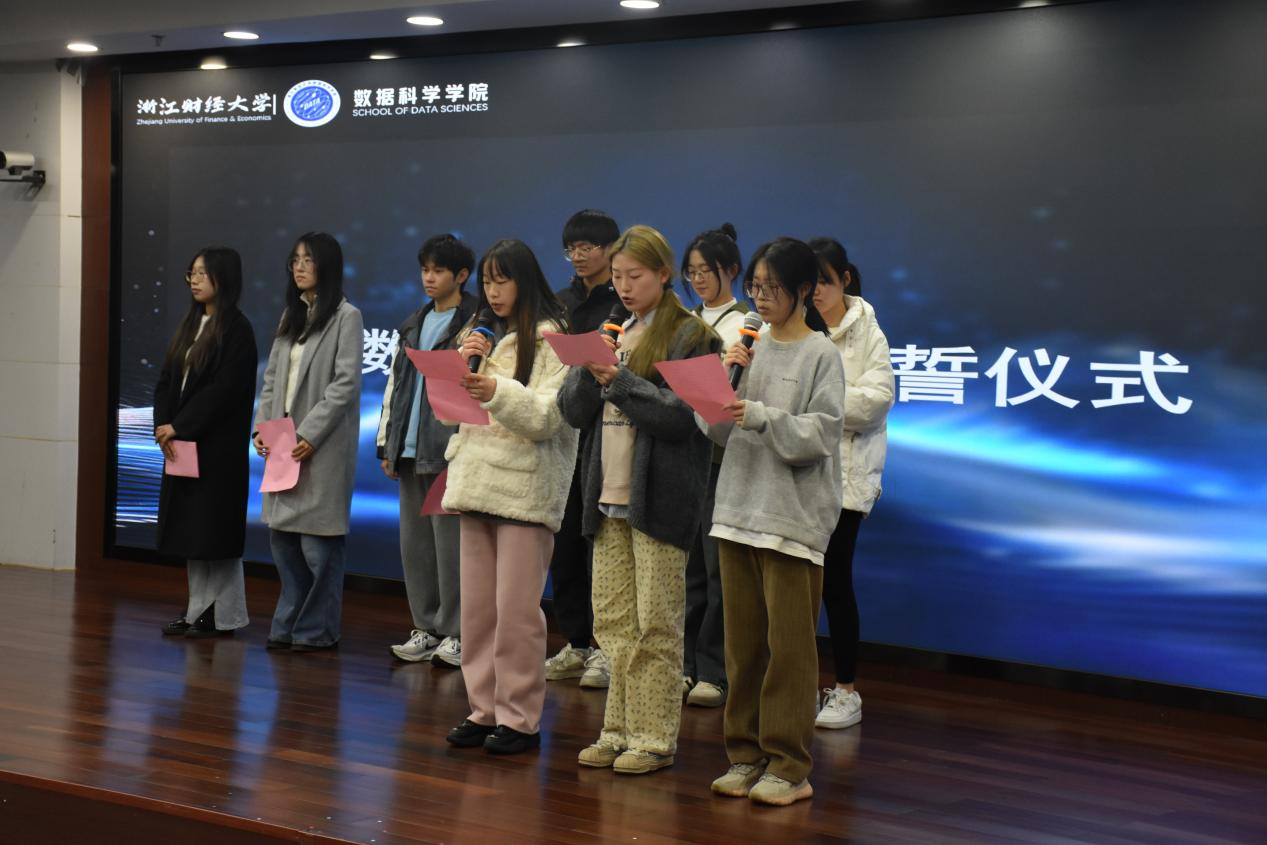 数科竞赛精神宣誓仪式也随之开展,负责人代表,新生代表以及学生指导人代表等9名同学进行了数科竞赛精神宣誓。庄严的宣誓不仅体现了他们对竞赛规则的尊重,对知识的热爱和追求,还展现了他们在困难面前永不放弃、团结协作、不断进取的竞赛精神。