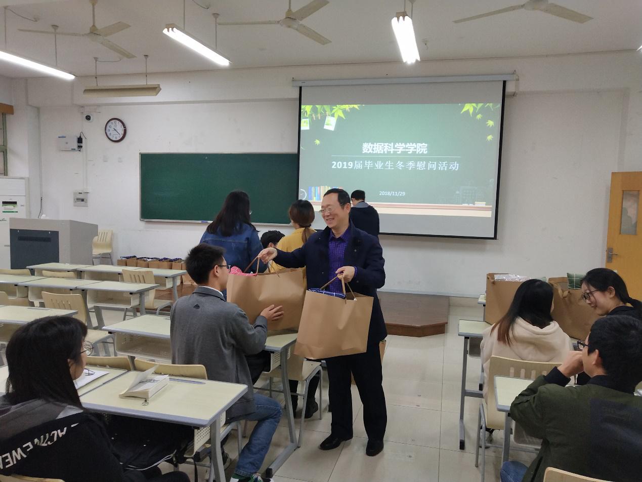 学院为各位同学准备了温暖又实用的礼物,在冬季为同学带来了无尽的暖意。在活动中,周老师关切地询问了同学们最近的学习情况以及健康情况,希望各位同学能够积极面对生活上的困难,在考研准备之于要照顾好自己的身体,直接就业的同学也要找准方向,选好单位。最后,周老师传达了学院对同学们的关心,周老师表示学院一定会为同学们提供最强大的保障,希望同学们努力学习,把握好机会,一定会在未来的时间里取得好成绩。
