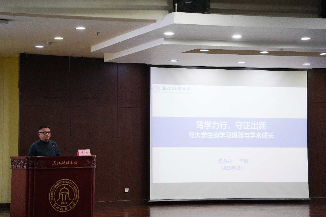 为引导新生尽快适应大学学习节奏,明晰学业规范与发展路径,12月4日下午,学院邀请学校教务处副处长李毅在学术中心第一报告厅为2025级新生带来了一场题为“笃学力行,守正出新:与大学生谈学习规范与学术成长”的讲座。讲座由教学副院长郑松教授主持。