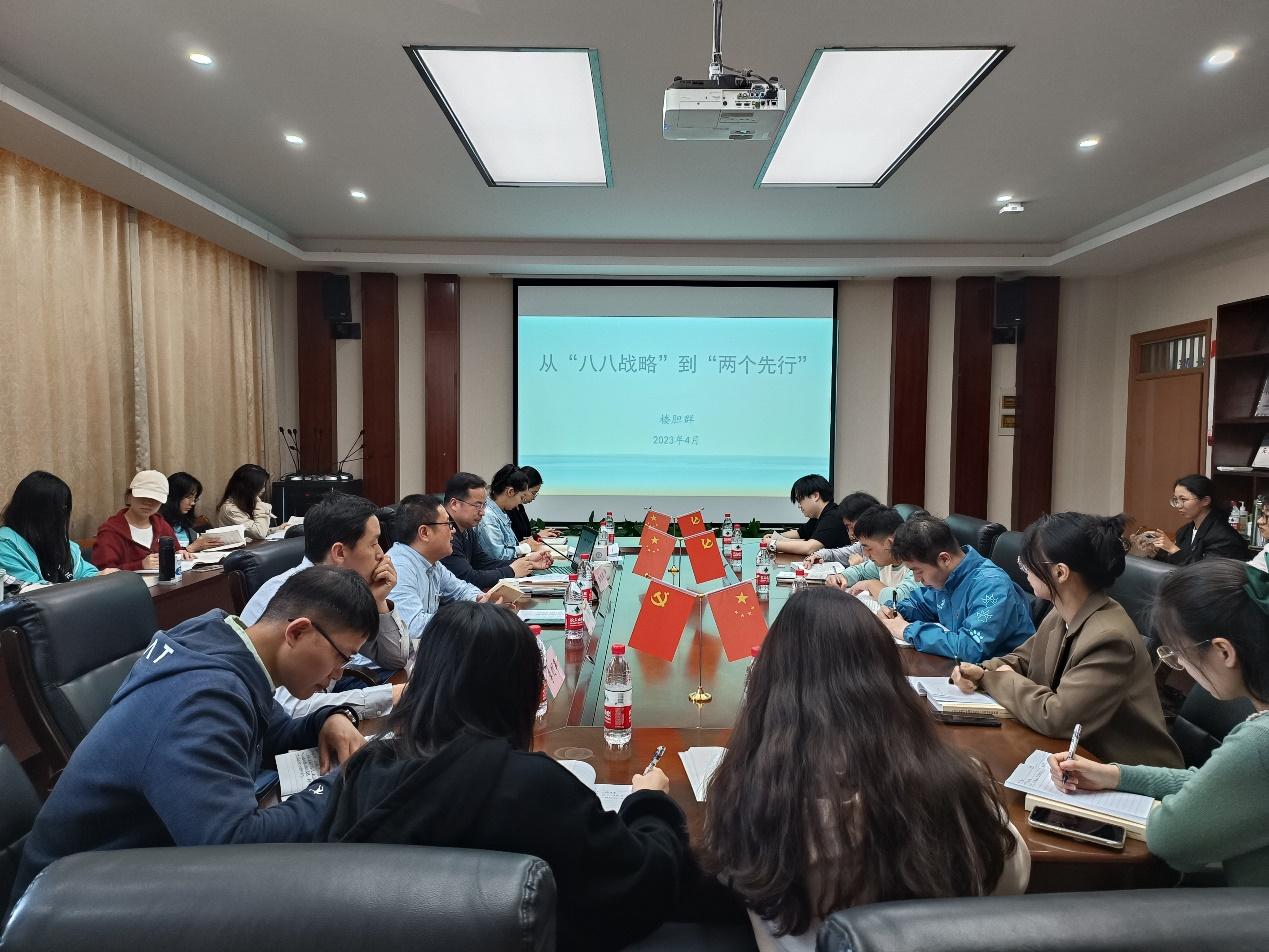 研究生第一党支部全体党员讲授《从“八八战略”到“两个先行”》专题党课。学院党委书记段雪辉主持,党委组织部吴婷、主题教育领导小组成员卢怡、学院组织员李钊军和研究生第一党支部全体党员参加。