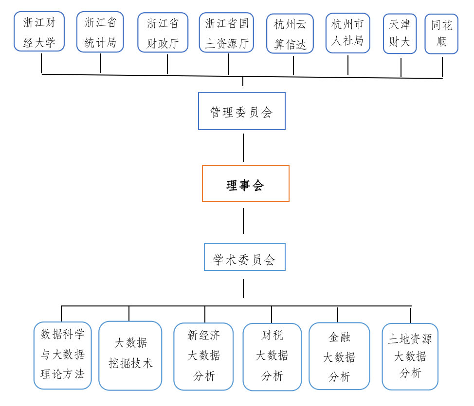 浙江财经大学数据科学与大数据分析协同创新中心(以下简称“中心”)是为了适应浙江省及全国以数字经济为核心的新经济发展、推进政府治理和公共服务能力现代化、防范金融风险、土地资源优化配置等重大需求,遵循“需求导向、联合攻关、协同发展”的原则,由浙江财经大学牵头,协同浙江省财政厅、浙江省国土资源厅、浙江核新同花顺网络信息股份有限公司、杭州云算信达数据技术有限公司、天津财经大学、加拿大英属哥伦比亚大学等单位共同组建。