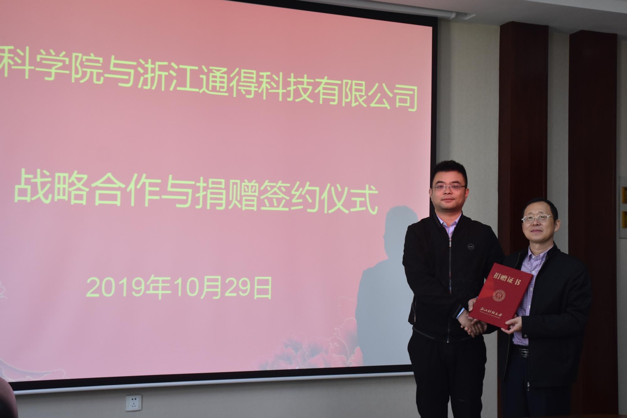 随后,通得公司总经理颜泾、数科学院院长洪兴建共同签订了通得“思源”大数据发展基金合作协议书。党委书记周君兴向颜泾总经理颁发了捐赠证书。