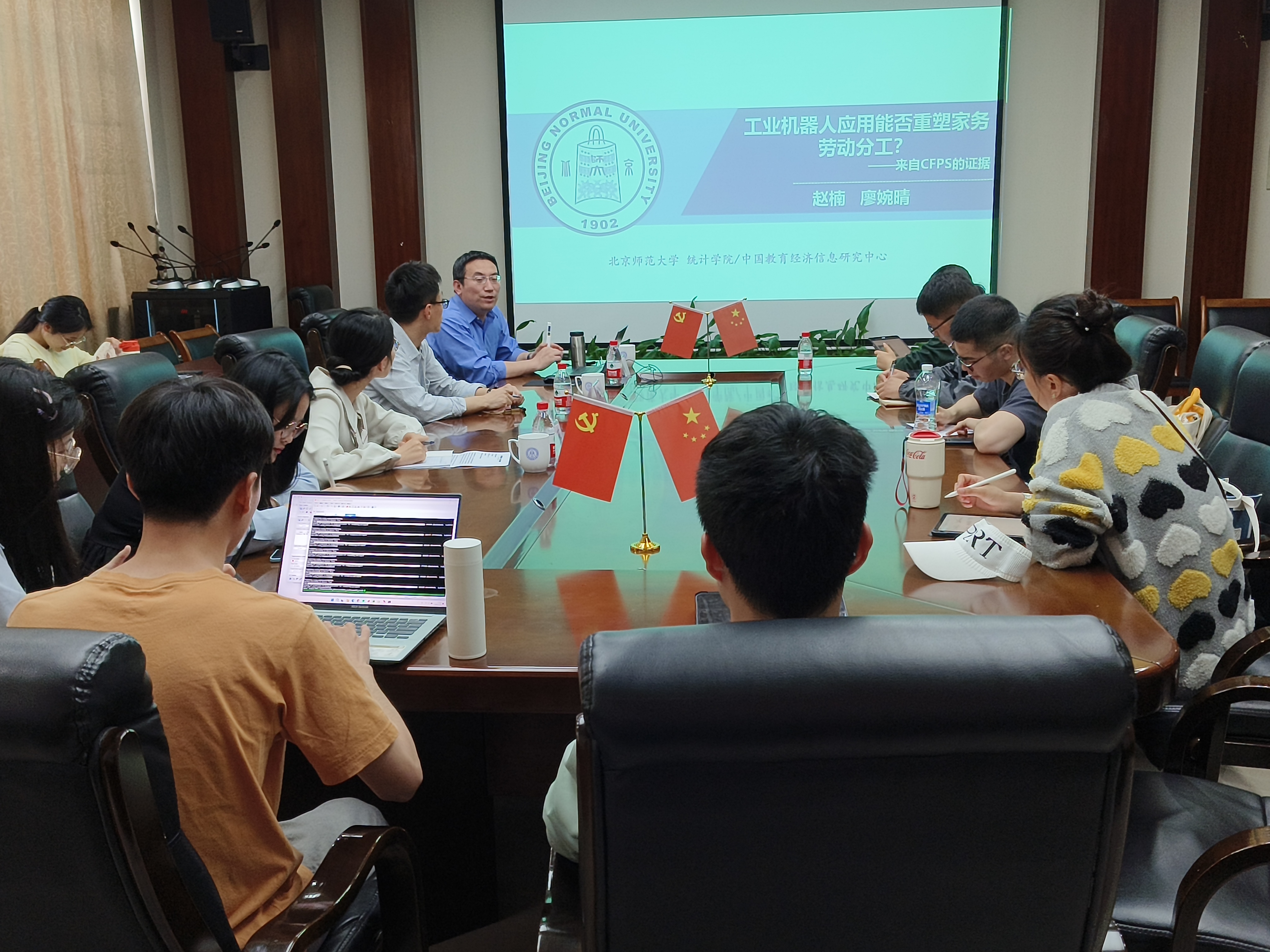 师生作了一场题为“工业机器人应用能否重塑家务劳动分工?”的讲座。讲座由经济统计系主任石薇主持,学院部分教师及研究生代表参加了此次讲座。