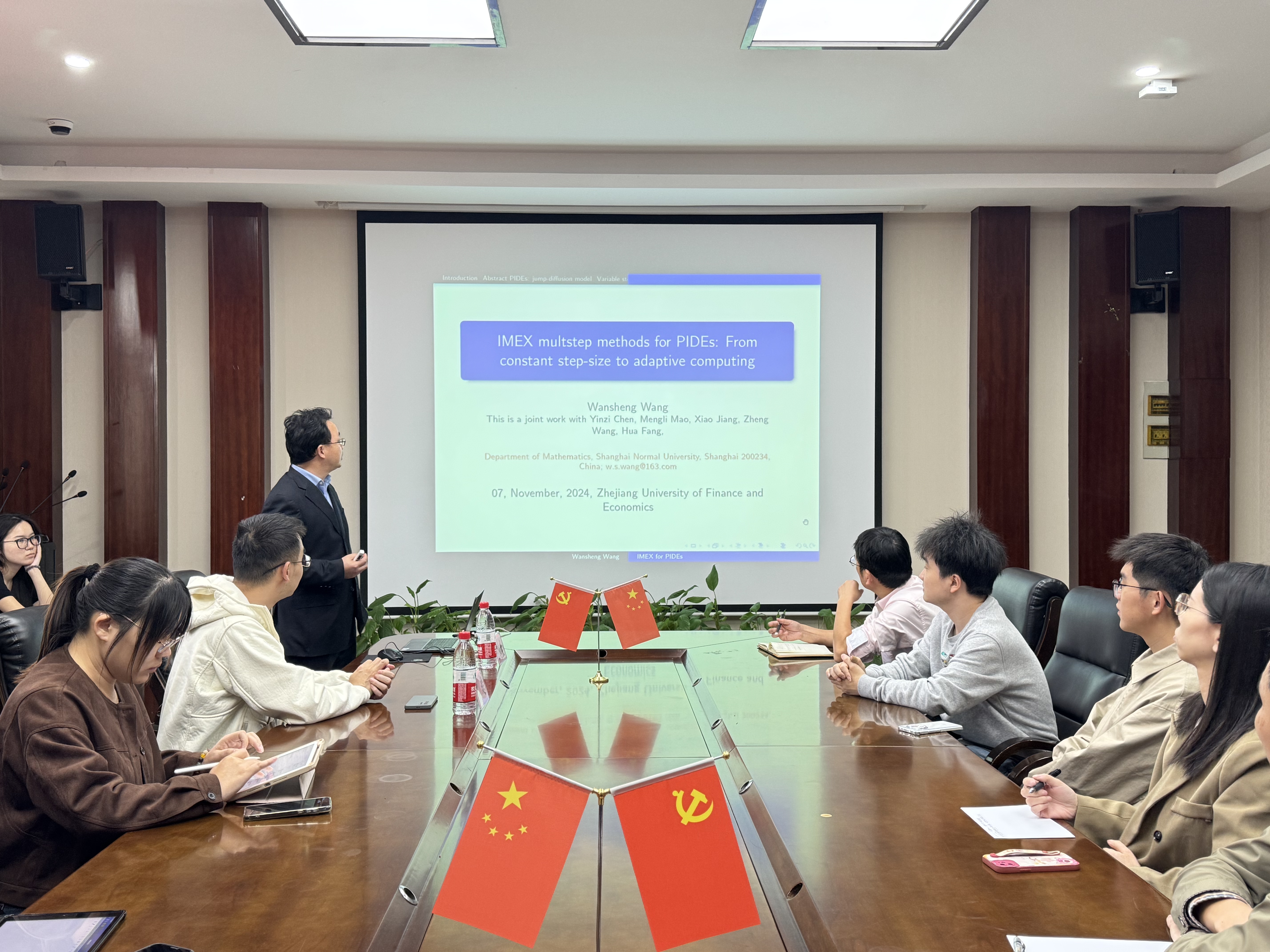 举行数海领航大讲堂2024年第18期。本期邀请上海师范大学数理学院副院长王晚生教授为全院师生带来一场题为“隐显多步方法求解偏积分微分方程:从常数步长到自适应计算”的学术讲座,讲座由金融数学系系主任郑超主持,部分教师及研究生参加了此次讲座。