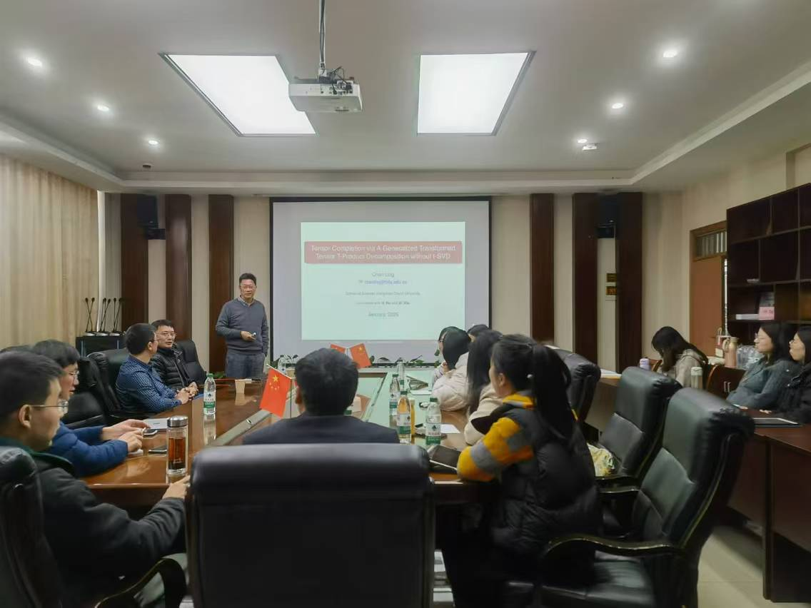 举行数海领航大讲堂2025年第6期。本期邀请杭州电子科技大学凌晨教授为全院师生带来一场题为“Tensor Completion via A Generalized TransformedTensor T-Product Decomposition without t-SVD”的学术讲座。讲座由副院长郑松教授主持,部分教师及研究生参加了此次讲座。
