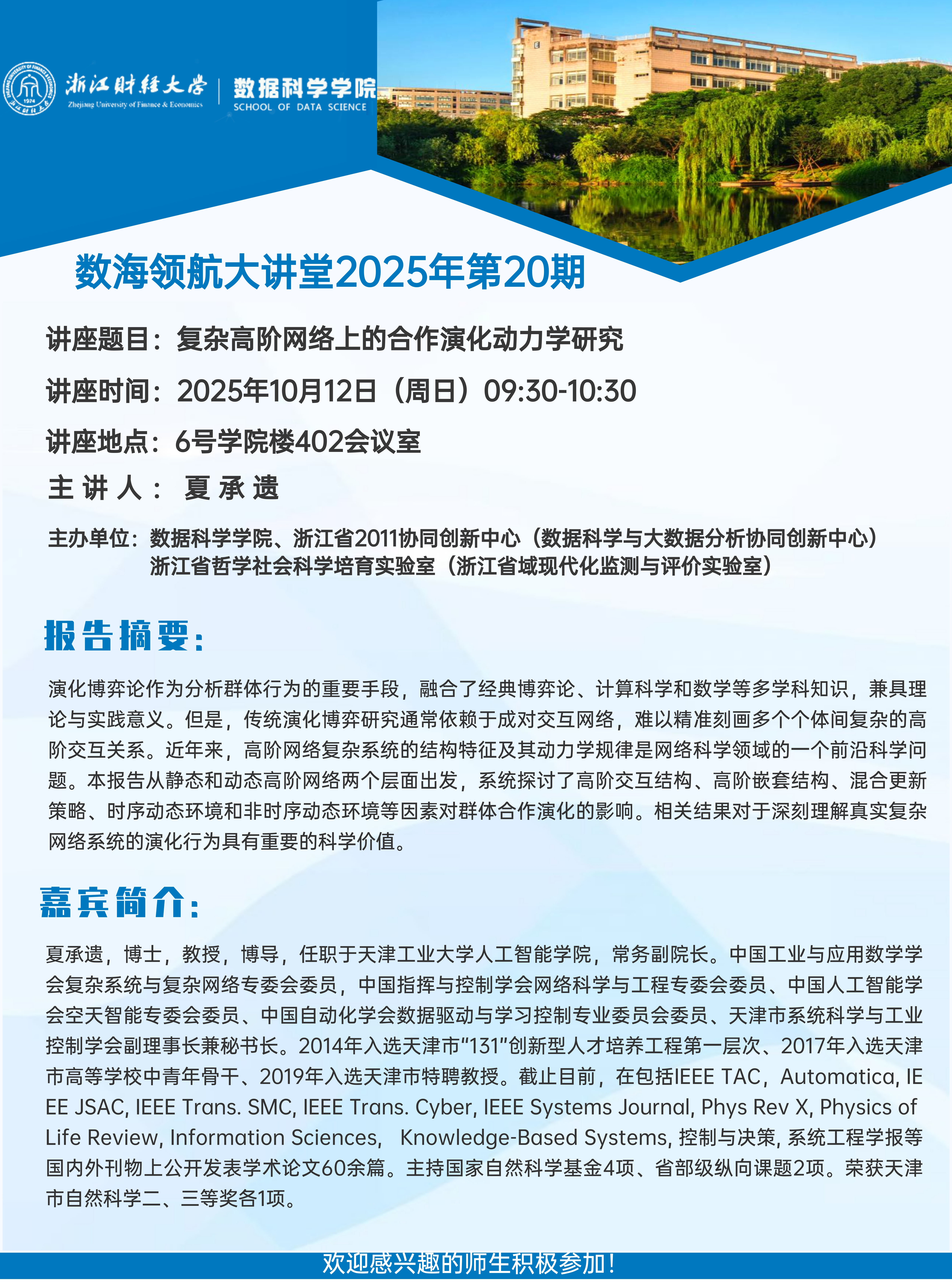 上一条:数海领航大讲堂2025年第21期——江苏大学董高高教授 下一条:数海领航大讲堂2025年第19期——合肥工业大学朱士信教授