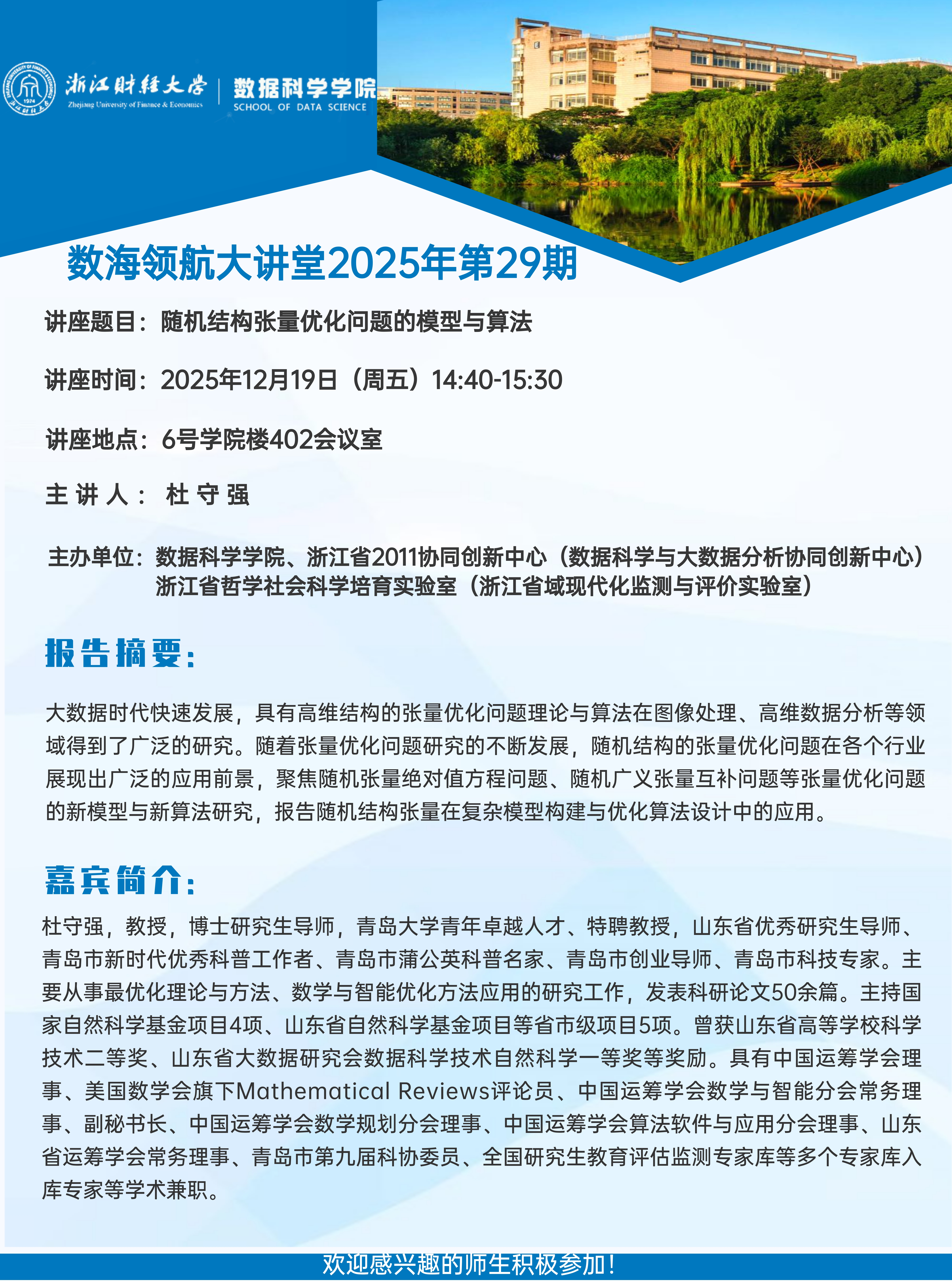 上一条:数海领航大讲堂2025年第30期——曲阜师范大学王宜举教授 下一条:数海领航大讲堂2025年第28期——太原师范学院凌晨教授