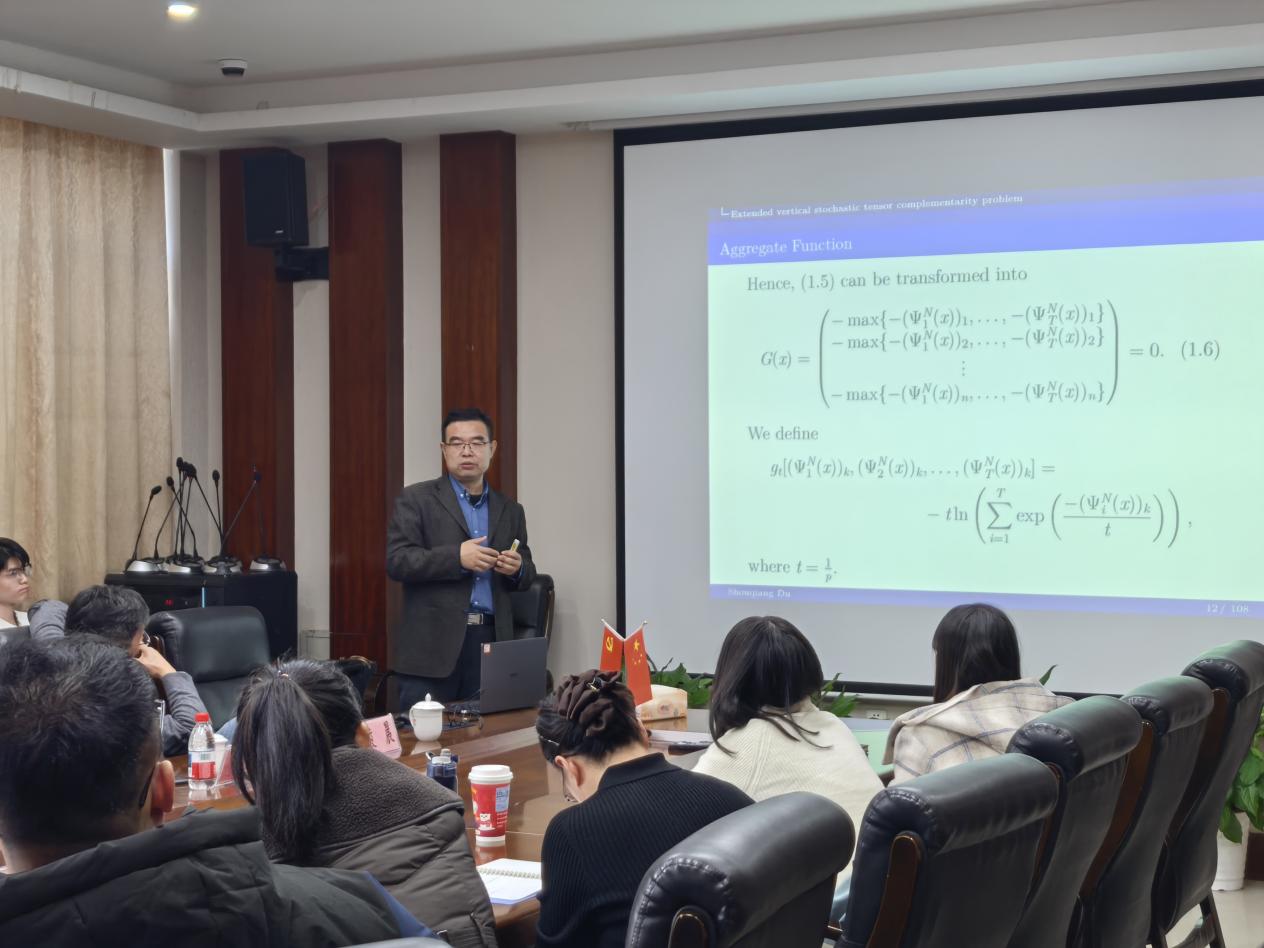杜守强教授围绕随机广义张量互补问题、离散随机绝对值方程、张量绝对值方程、随机张量绝对值方程等四类重要问题展开了系统深入研究。在讲座中,杜教授精准分析每类问题的特性与难点,建立了四类随机张量问题的新模型,并分别提出了SAA、Projected Barzilai-Borwein算法、STRF-DT(基于动态阈值的光滑化信赖域过滤算法)、投影信赖域方法等方法进行高效求解。在一定的条件下,证明了相应算法的全局收敛性。