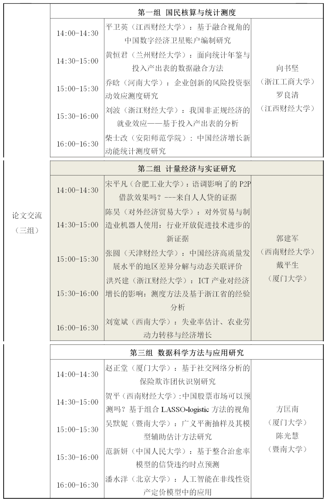 第一分会场报告的三位主持人分别是浙江财经大学周银香教授、浙江工商大学向书坚教授和江西财经大学罗良清教授。该组交流的主题是“国民核算与统计测度”,来自江西财经大学的平卫英、兰州财经大学的黄恒君、河南大学的乔晗、浙江财经大学的刘波以及安阳师范学院的柴士改分别作了精彩报告,会场讨论气氛非常热烈。