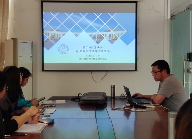 许林副教授首先从分位数回归、变量选择和稳健估计等角度向大家介绍了研究背景和基本方法,而后重点阐述了MM算法替代函数的寻找方法和弱变量选择的实用价值,并针对动态阈值选择带来的模型拟合效率的改进机制进行了分析。