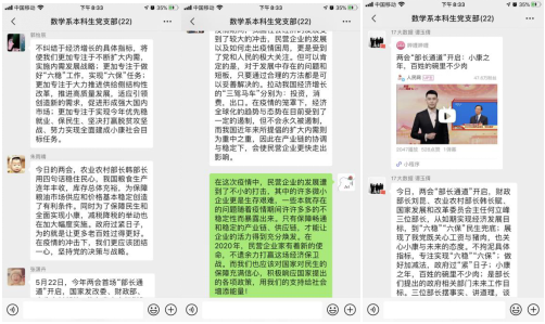 “每日一视频”活动是金融数学与大数据本科生党支部的党建学习活动品牌,逢党和政府的重大会议或重大热点事件进行,学生党员自主选择相关短视频,进行分享和讨论。此次两会期间,每晚7时,都会有一名支部成员在微信学习群里分享一则全国两会相关小视频,其他支部成员围绕视频内容开展讨论。几天来,支部已经围绕“六稳”“六保”、民营企业发展、工匠精神、医闹问题等进行了热烈讨论。