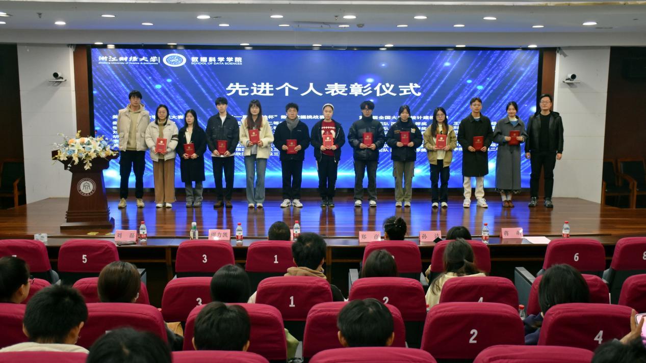 随后,进行了先进个人表彰仪式。周力凯老师和刘磊老师、孙洁老师和郑彦老师、陈巍嘉老师和芮紫薇老师分别为数据科学学院学科竞赛先进个人、实践创新先进个人、学术创新先进个人颁奖,并为他们送上了真挚的祝福,希望数科学子再创辉煌。