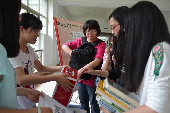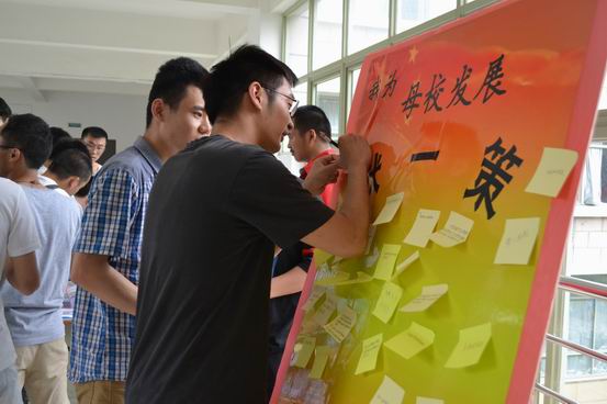 大四的毕业生们陆续到达了AB教学楼过道的活动现场,在工作人员为他们介绍了六个一工程的具体活动流程后,活动正式开始。“捐一元钱,献一份爱”活动中,毕业生们用自己手中小小的硬币表达着对母校的热爱和眷恋。接下来的“我为母校发展献一策”活动中,满满一展板的便利贴,诉说着大四老生对学校发展提出的建议以及未来美好的希冀。而在捐献书籍的活动中,大四的同学们也给大家带来了自己的旧书,把自己的爱心献给了更多需要帮助的人。