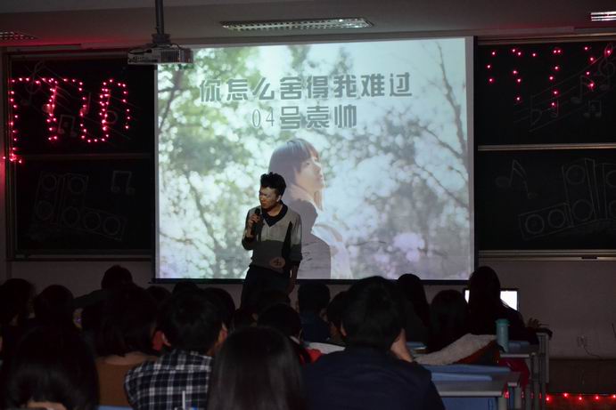 十佳歌手初赛在金融学院102教室举行,担任此次比赛的评委有院艺术团团长李美欣,2013届十佳歌手冠军高凌宇以及校文艺部部长胡科益。
