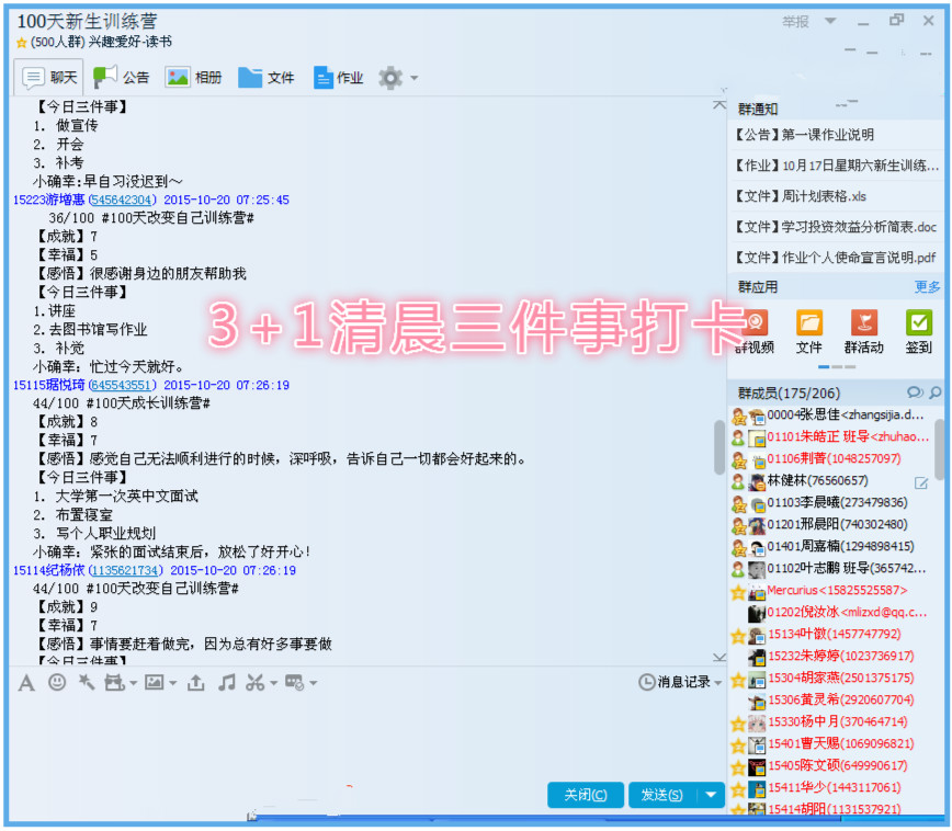 在新生入学时,学院就设置了专门的训练营QQ群,入群新生统一编号,群内只能做一件事,那就是清晨三件事打卡活动。新生们每天早起后,做的第一件事就是在QQ群里打卡,列出自己当天要做的重要三件事以及一件小确幸,给自己昨天的成就感和幸福感打分,并写下感悟与其他同学分享。到目前为止,大部分新生已经坚持打卡50多天,通过三件事的计划和执行,新生们逐渐适应了大学生自主的学习方式,对大学生活更有掌控感。