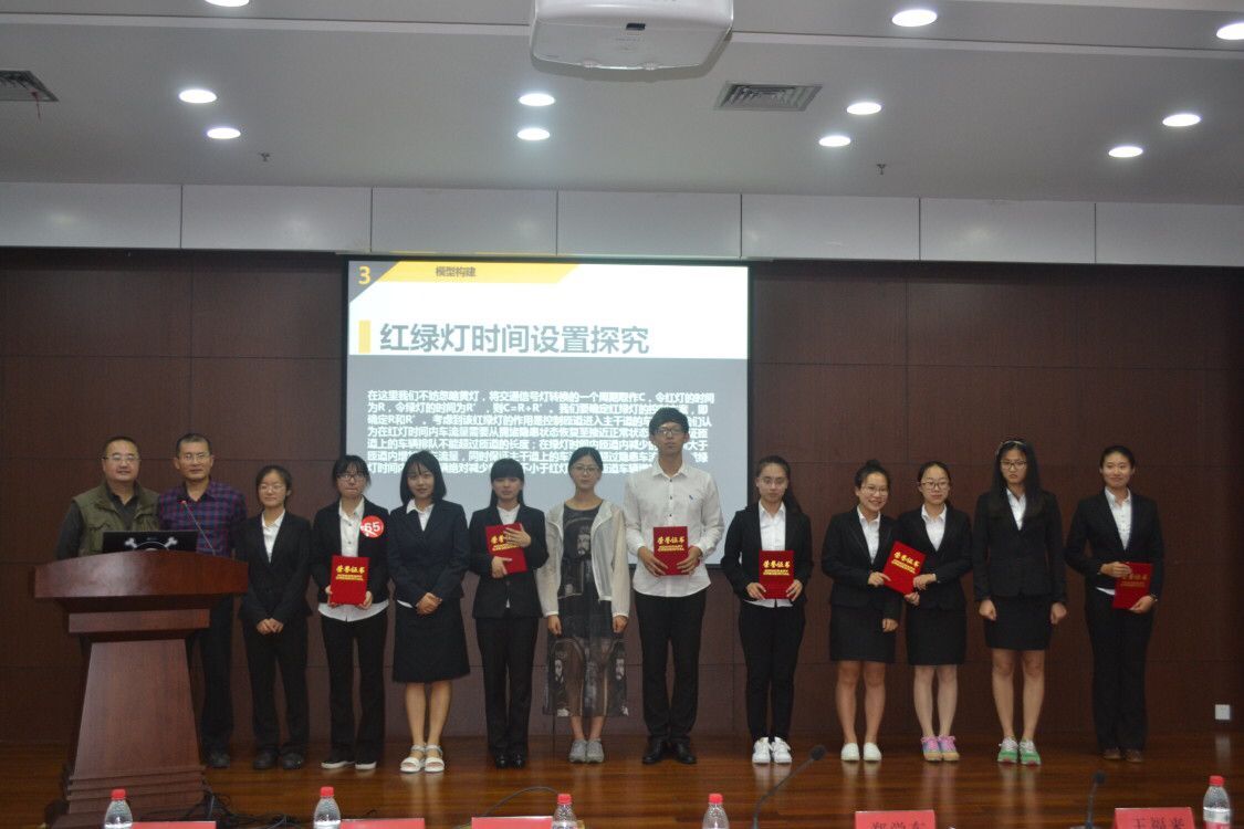 本次大赛的题目是关于杭州德胜高架的红绿灯设计问题,在大赛中,选手们向大家展示了自己的论文成果。他们对德胜高架红绿灯设置问题提出了各自独到的看法。报告中的翔实的数据、精巧的建立模型、经典的案例都表现出同学们参加数学建模大赛的热情和一丝不苟的态度。评委也很犀利的点出了同学在模型的建立和论文的论述方面的问题,来促进学生成长。最终蒋佳霖、董博娜、张文小组获得一等奖,何燕华、徐秀琳、施雨琛、王祥各、顾奕卉、张海伦获得二等奖,王佳琦、叶倩雯、朱雯佳、郭萌、陈应艳、周莹、王璐茜、王晶、郭琨获得三等奖其他各组获得优胜奖。