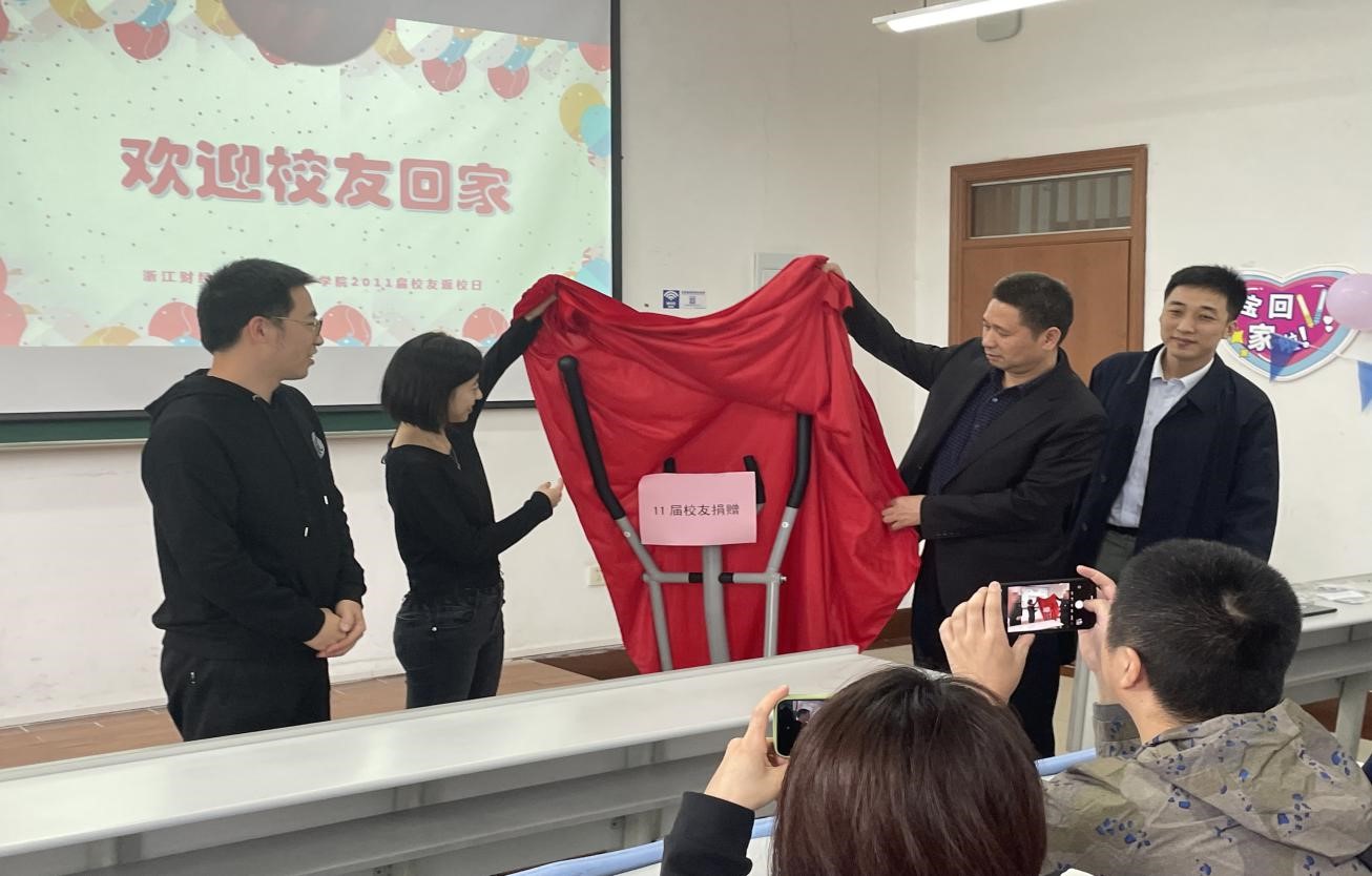 来自11届的校友们也上台分享自己回校的感想,表达了对学院的感恩、想念、自豪以及对学院的祝福。随后,各班代表们和洪院长一起掀开校友们捐赠的运动器材,他们也表达了对学院的更高期待。