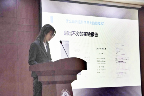 最后,浙江省海洋知识创新大赛特等奖团队登台分享他们的实战经历。这支团队创造了我校在该赛事上的最好成绩,同时也体现了数据学子勇于跨学科、跨领域开展探索与应用的创新精神。
