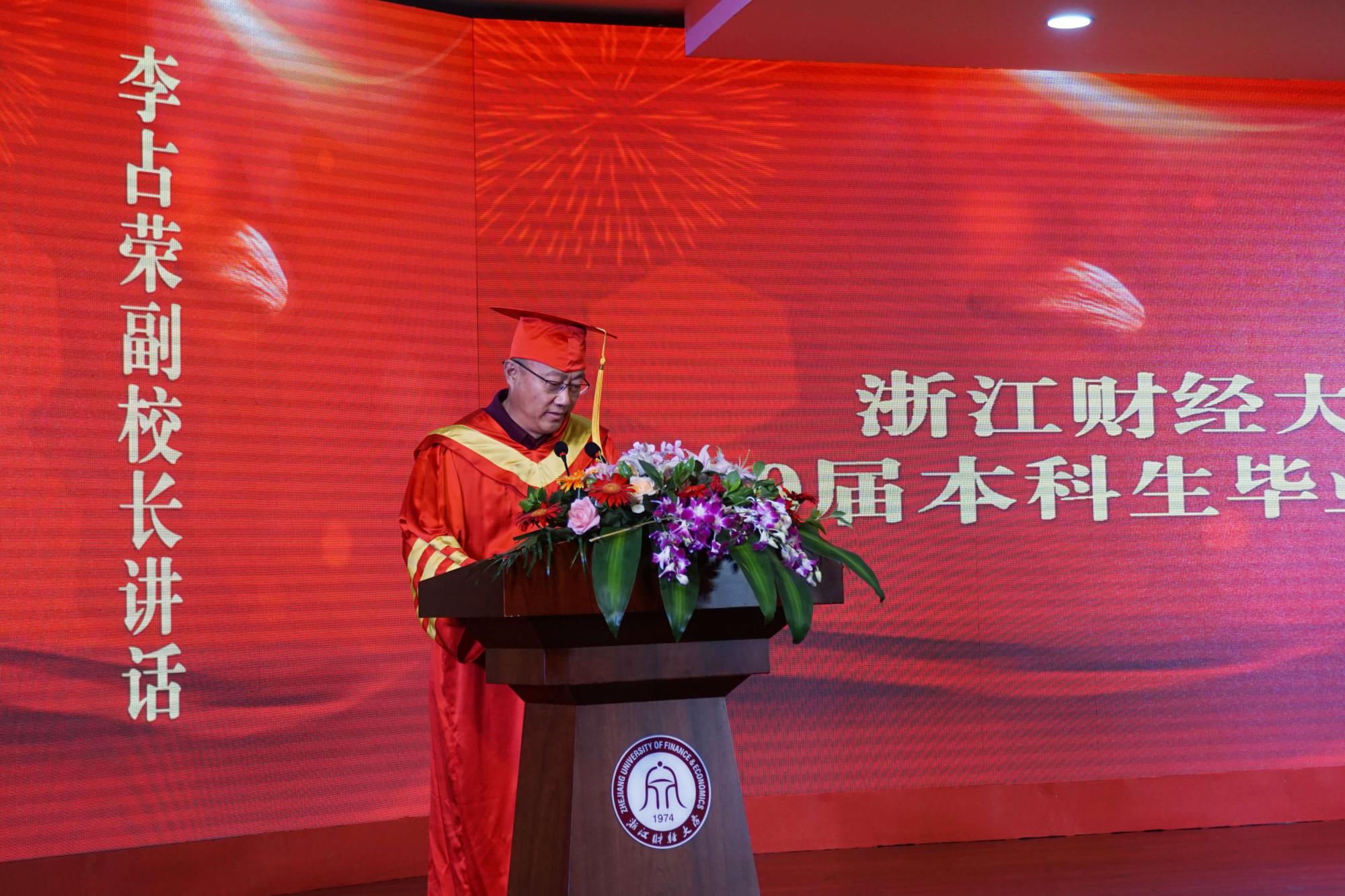 2020届本科生毕业典礼暨学位授予仪式在学术中心第一报告厅隆重举行。浙江财经大学副校长李占荣出席典礼,学院领导班子、各系部负责人、毕业生综合导师代表以及数科学院全体2020届本科毕业生参加了典礼,典礼由副院长李杰主持。