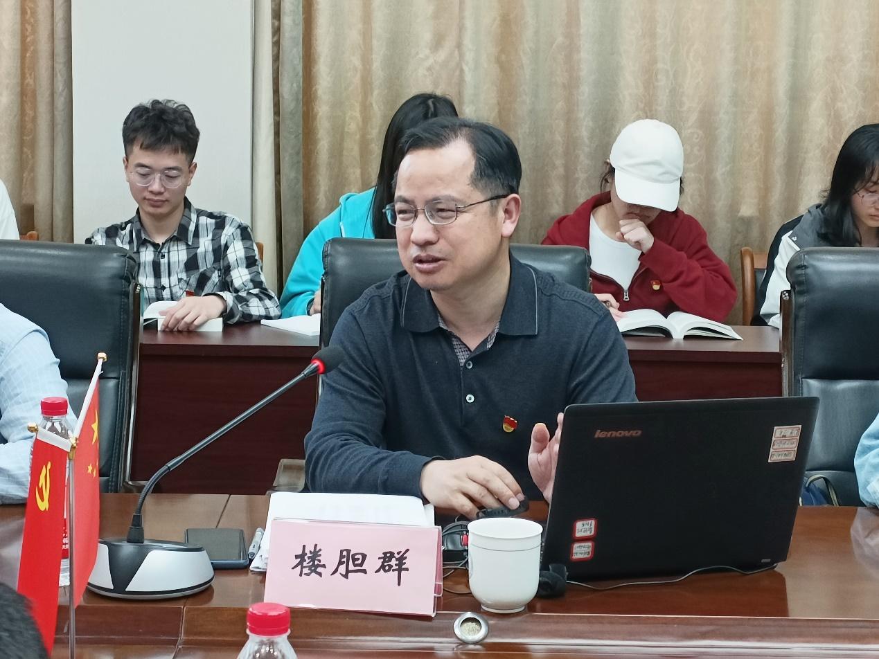 5月9日下午,校党委委员、组织部、宣传部、统战部部长楼胆群为数据科学学院研究生第一党支部全体党员讲授《从“八八战略”到“两个先行”》专题党课。学院党委书记段雪辉主持,党委组织部吴婷、主题教育领导小组成员卢怡、学院组织员李钊军和研究生第一党支部全体党员参加。