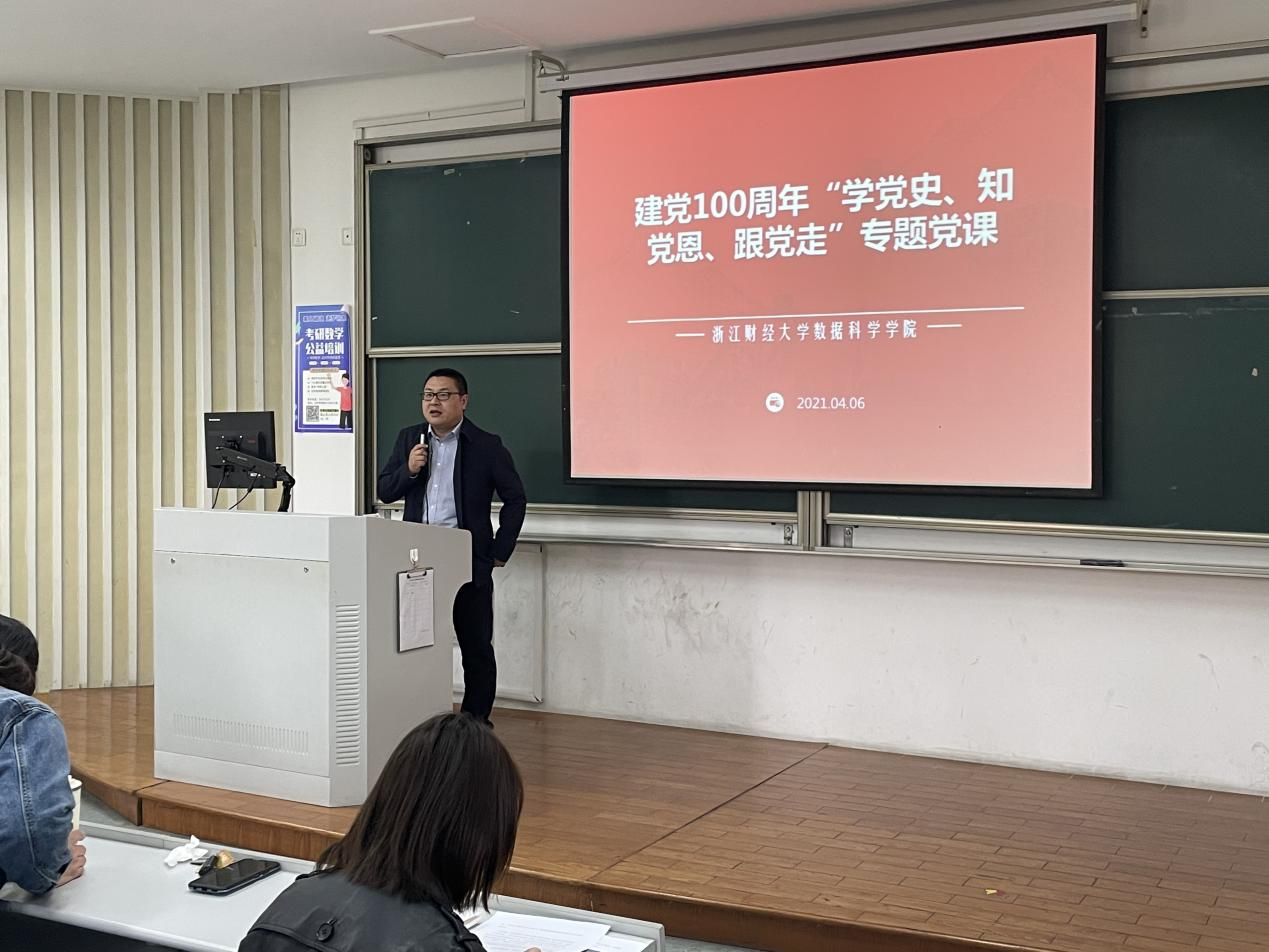 2021年4月6日,数据科学学院在学院楼111教室举办了建党100周年“学党史、知党恩、跟党走”专题党课。学院党委书记段雪辉、党委副书记何露霞,组织员李钊军老师、学生支部书记江挺老师、蒋萌老师、徐翠老师、陈巍嘉老师出席了党课,数据科学学院研究生入党积极分子全体到场聆听。