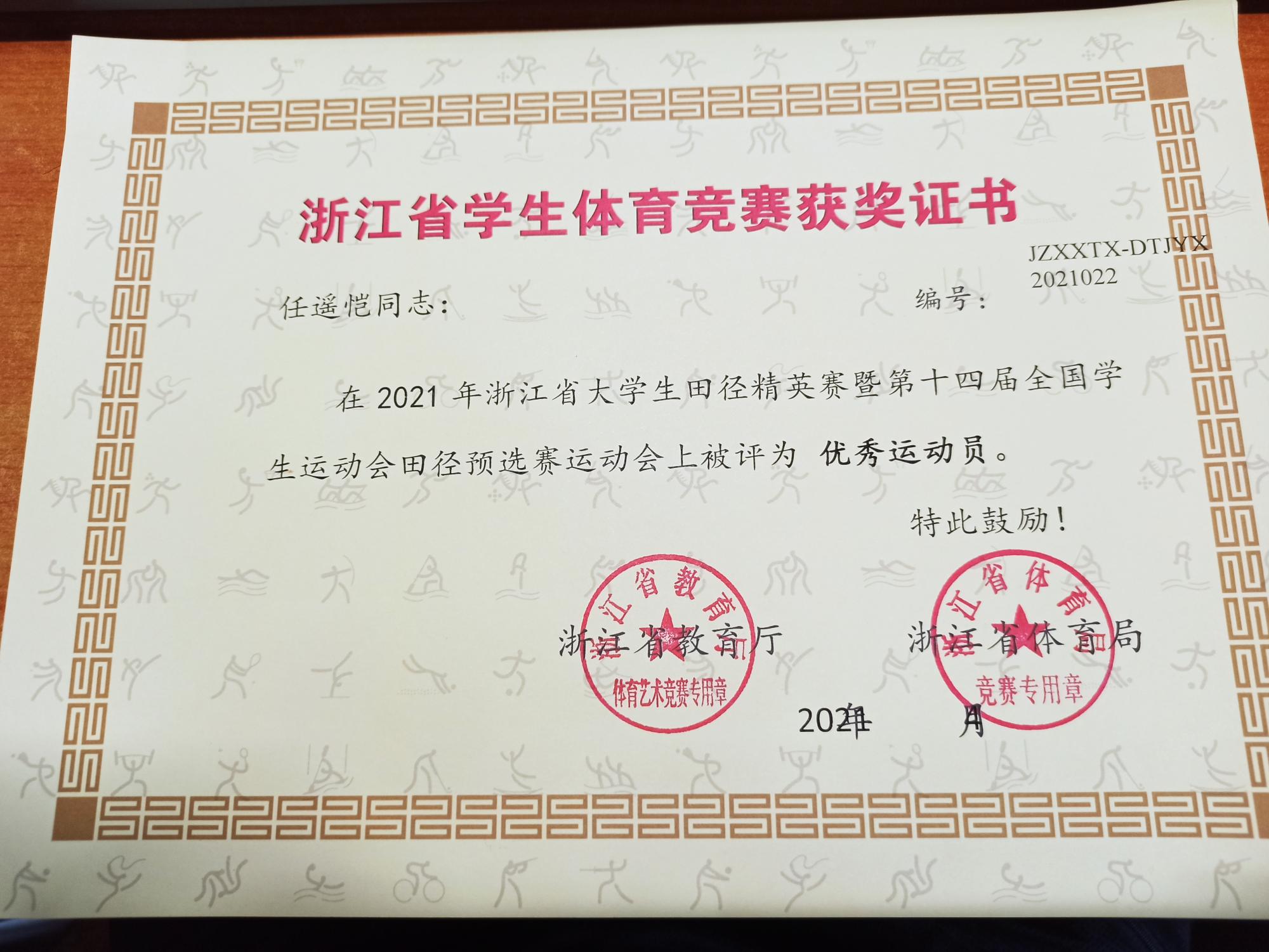 研究生第一党支部成员任遥恺在2021年浙江省大学生田径精英赛喜获佳绩。