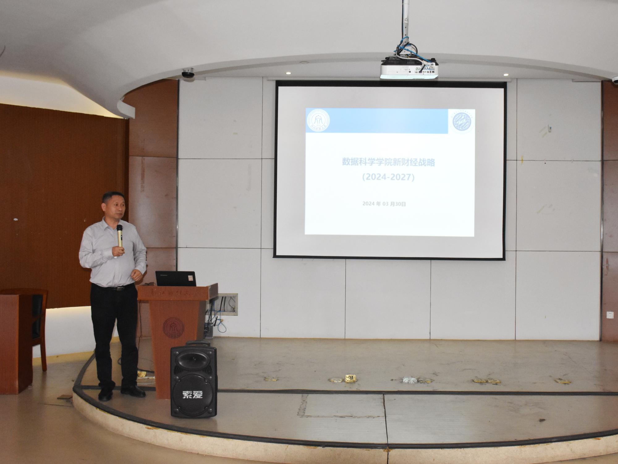 院长洪兴建向全体教职工介绍学院全面落实“新财经战略”的路径规划和任务安排。他介绍了学院目前面临的困难,以及在我校“新财经战略”全局中,数科学院应有的站位和担当;以图文并茂的形式,分析了学院在学科建设、科研攻坚、党建工作、校园文化、社会服务等方面的路径规划和重点任务;明确了各模块工作的责任人、目标和时间节点。
