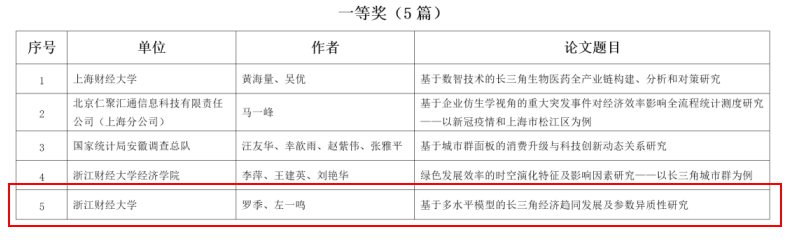 近日,由长三角一体化发展统计监测协调领导小组办公室组织开展的第一届长三角统计论坛征文评选结果揭晓,由直播足球比分 罗季教授、2021级应用统计专业硕士研究生左一鸣共同完成的论文《基于多水平模型的长三角经济趋同发展及参数异质性研究》荣获一等奖。