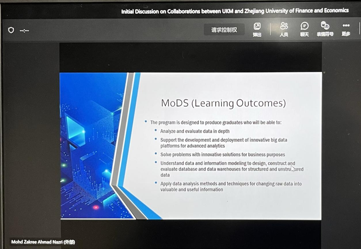 洪兴建首先介绍了学院的专业设置、师资团队及国际合作情况,并提出与马来西亚国立大学开展广泛的国际合作愿景。乐斌进一步介绍了我校目前开展的国际合作项目基本情况。扎克里·纳兹里等详细介绍了学院目前开设的数据科学硕士课程,包括培养目标、录取标准,课程模块等内容。
