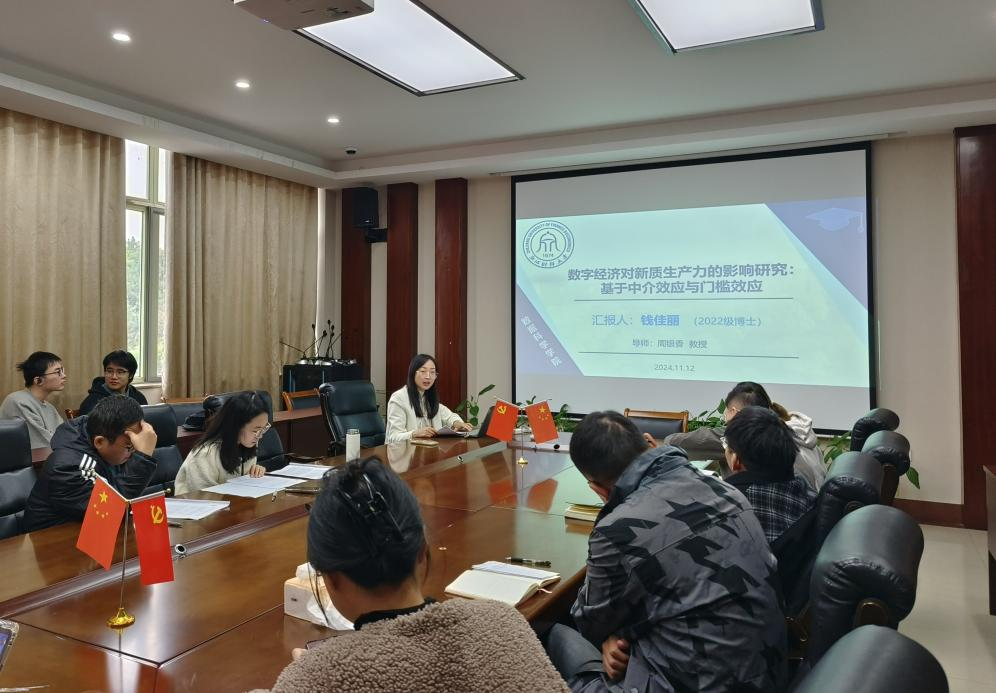 钱佳丽作题为《数字经济对新质生产力的影响研究:基于中介效应与门槛效应》的学术报告,她从理论层面深入剖析了数字经济通过技术创新和产业升级等途径推动新质生产力提升的内在机制并提出了相关假说。同时,利用多年份的中国省市数据构建了包含中介效应和门槛效应在内的多种模型对数字经济对新质生产力的实际影响进行了全面而深入的实证检验。